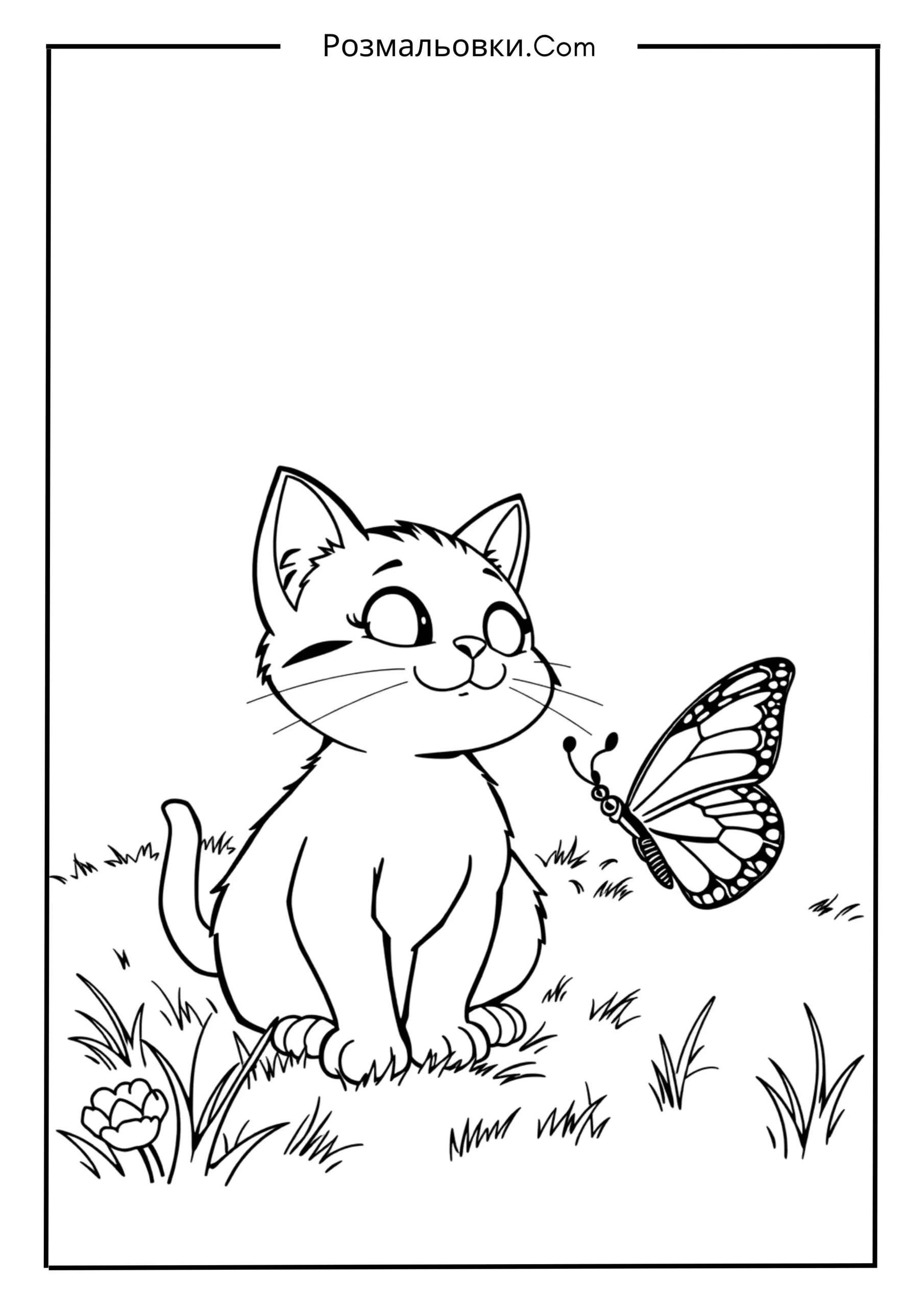 Котик ловить метелика на лужку. Ця котик розмальовка ідеальна для розвитку фантазії та творчого мислення у дітей.