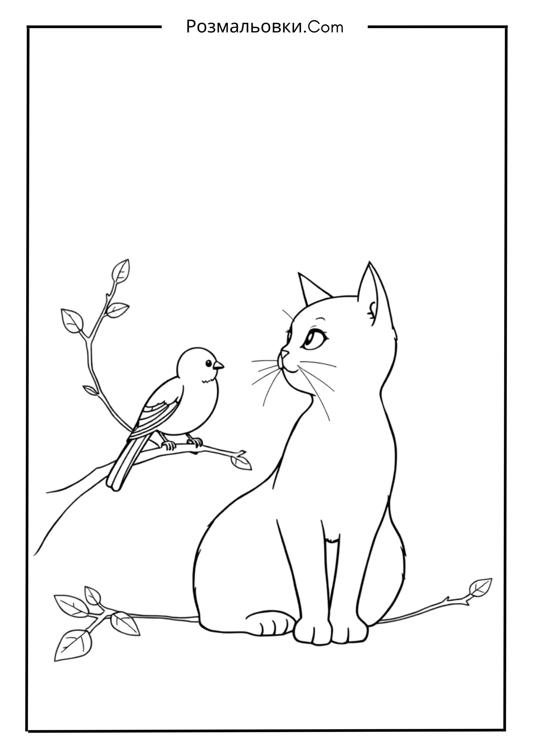 Котик спостерігає за пташкою на гілці. Використовуючи цю розмальовка котика, діти розвивають уважність до деталей та контраст кольорів у малюнку.