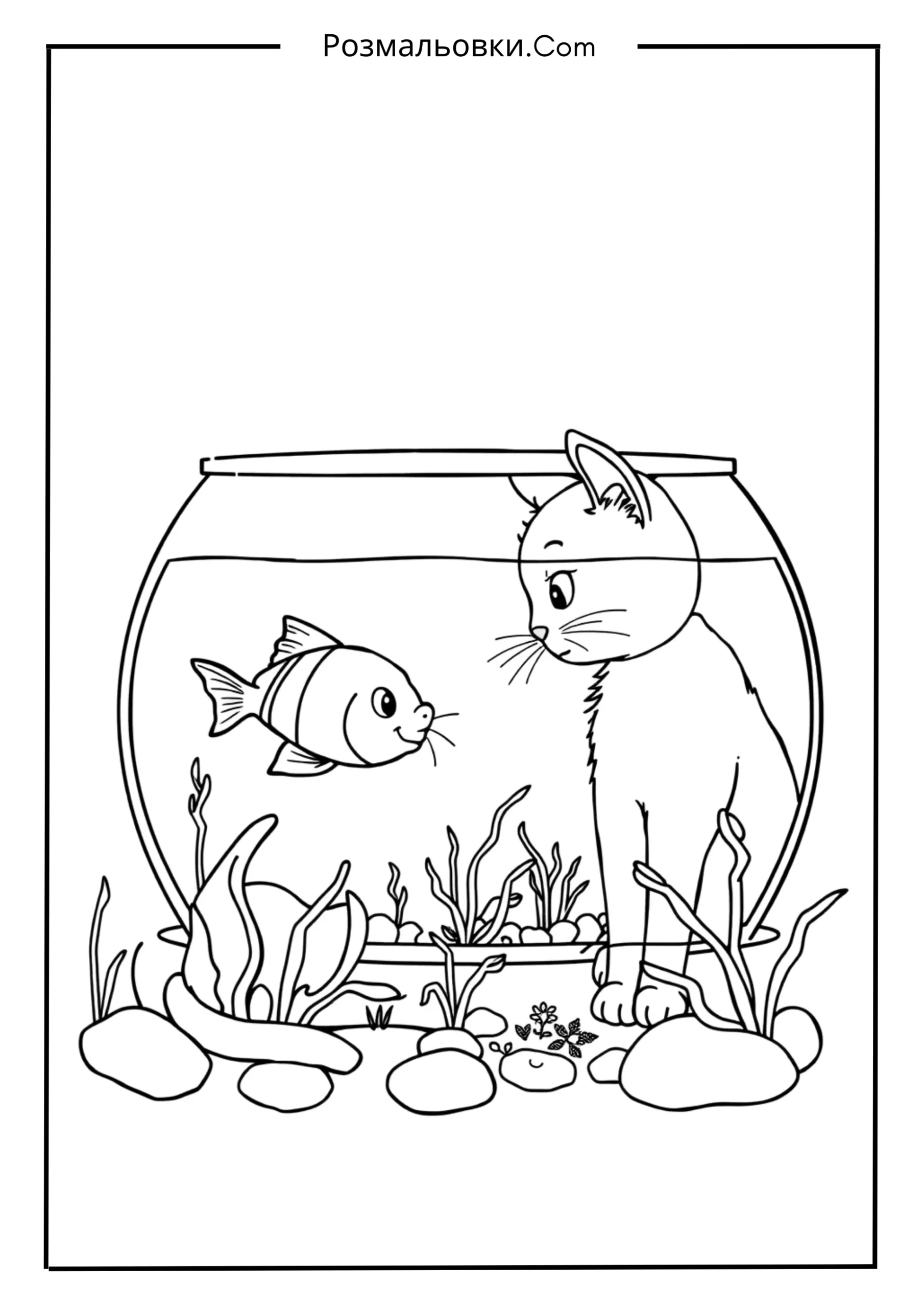 Котик цікаво дивиться на рибку в акваріумі. Ця розмальовка кіт допомагає навчитися поєднувати сині, зелені та жовті відтінки