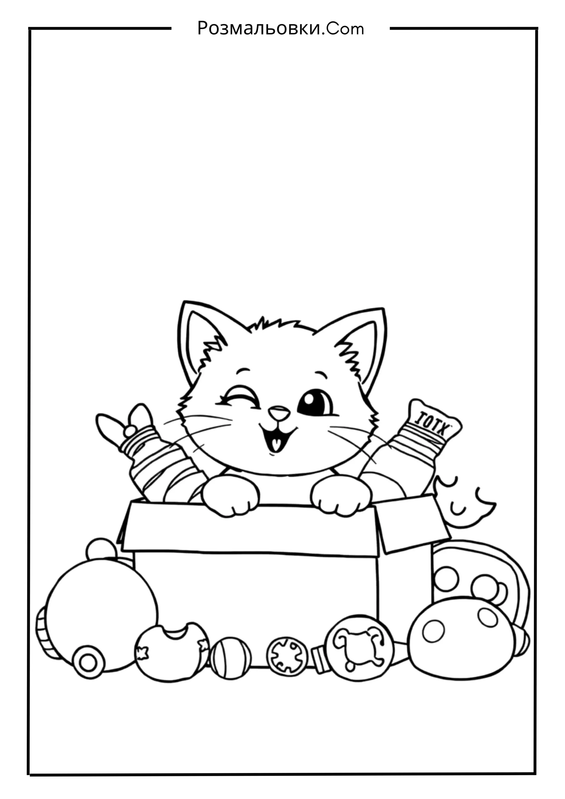 Веселий котик ховається в коробці серед іграшок. Ця роздрукувати розмальовки котика сцена проста та мила, ідеальна для початківців.