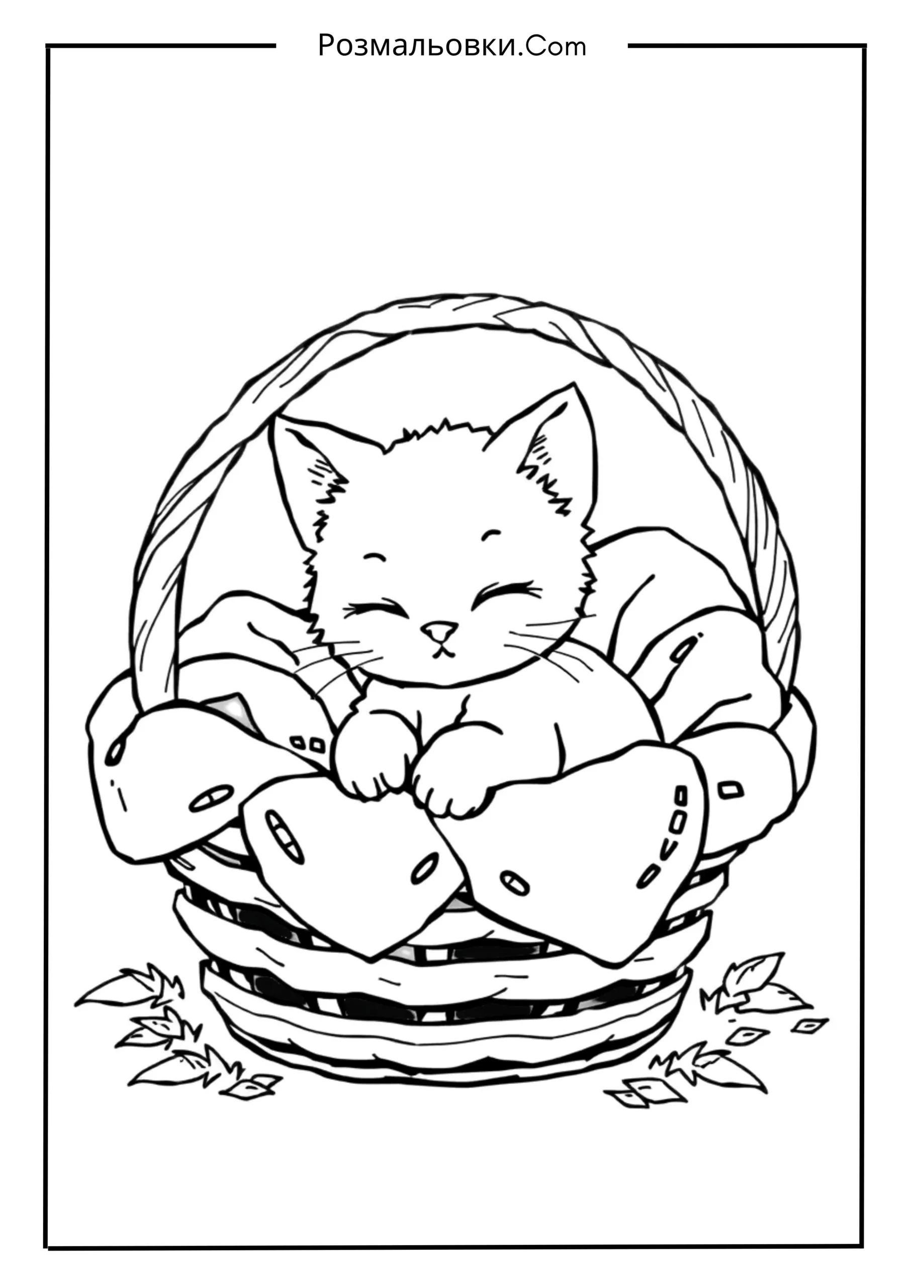 Маленький котик відпочиває в кошику серед пледів. Використовуючи цю розмальовка котика, діти тренують точність і терпіння при розфарбовуванні деталей
