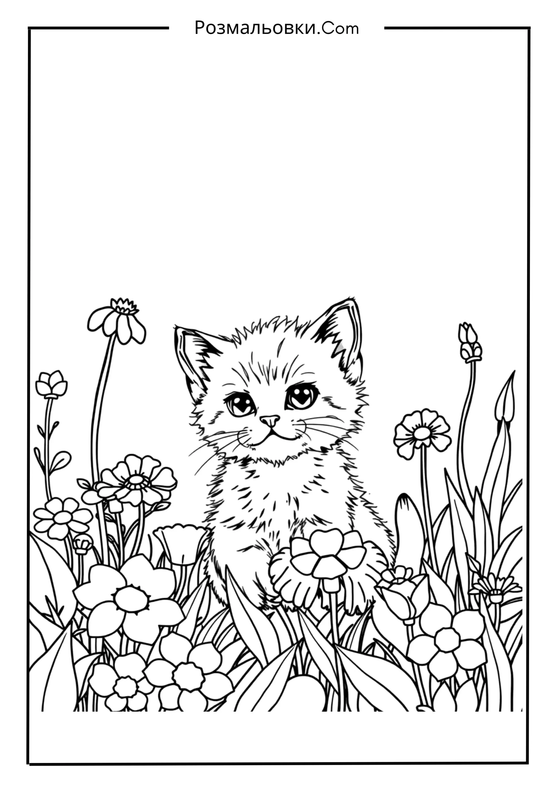 Милий котик грає серед квітів і трави. Ця розмальовка котик роздрукувати допомагає дітям навчитися поєднувати кольори та створювати реалістичні природні сцени.