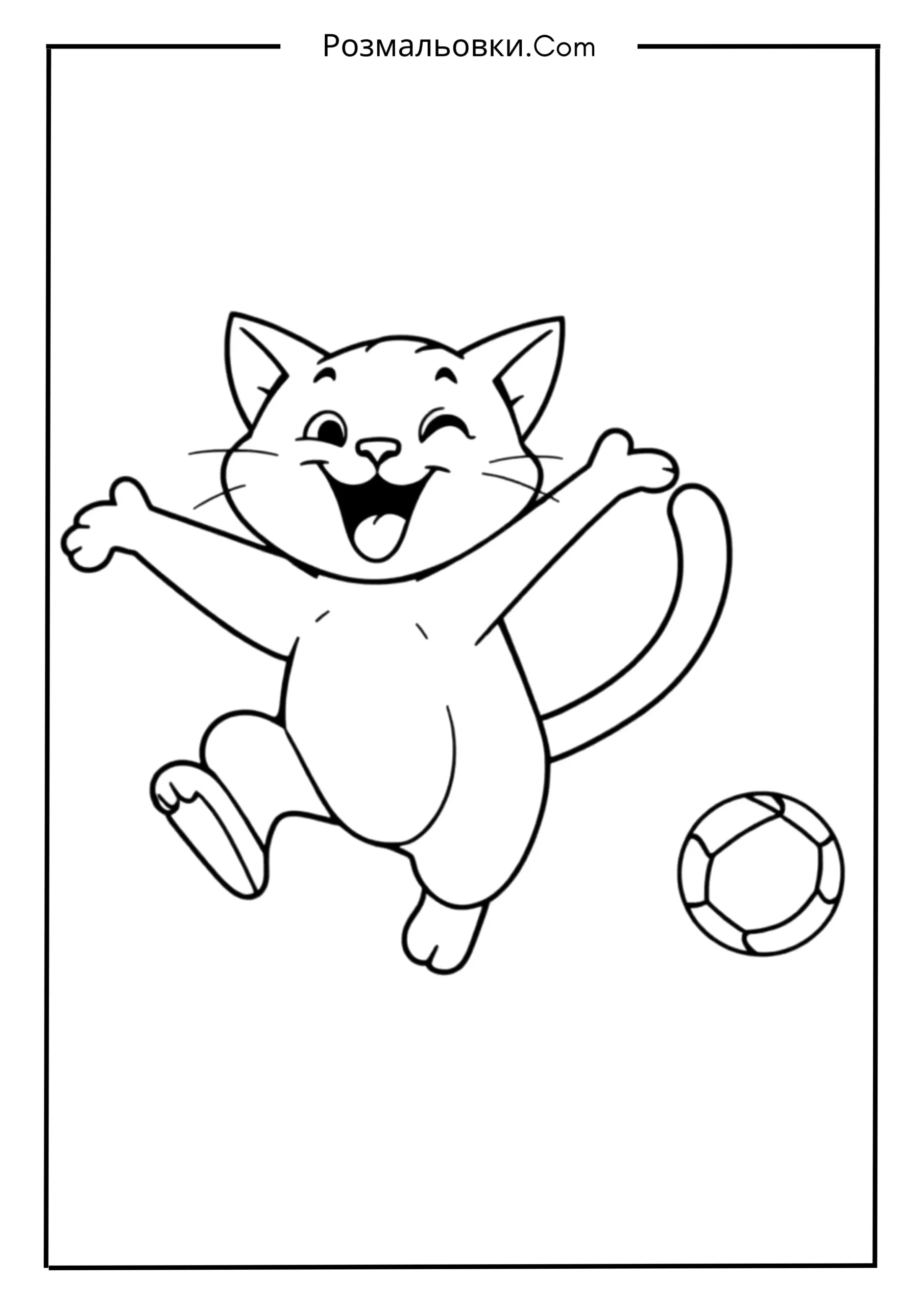 Веселий котик стрибає за м’ячиком. Ідеальна котик розмальовка для розвитку дрібної моторики та навичок координації рухів у дітей.